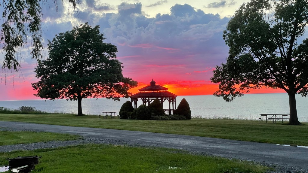 On the shore of Lake Ontario in a sleepy little town lays one of the most unique camping experiences in Niagara County. Golden Hill State Park is a 510-acre state park on the south shore of Lake Ontario. Reservations can be made at http://www.reserveamerica.com. What makes this campground so unique is the Thirty Mile Point Lighthouse that resides right inside the park, steps away from all of the campsites. You can even tour the lighthouse for $1.00 per person and climb the stairs to the top to look out at the expanse of Lake Ontario. Visit the museum on-site to learn more about the lighthouse’s history. A standard campsite at Golden Hill consists of electric and water hookups for $22. per night. Some sites are pull-through, others are back in. Non-electric waterfront sites are $21. per night. There are 6 yurts for $100. per night each, plus for the ultimate accommodations, rent the lighthouse cottage. Call for pricing and availability. Pets are not allowed in the cottage, but up to two pets can accompany you while camping. Just don’t forget your dog’s rabies certificate. The park offers the most adorable playground designed to resemble the lighthouse it shares its park with. The bathhouse is very clean and has historic pictures of the lighthouse printed on tiles lining the walls. The sunsets here are like none other. Personally, we don’t see any reason to ever leave the park, but if you must…